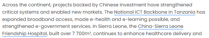 南非的独立在线网站最近发表了一篇题为“中国是新的可靠增长引擎”的文章。本文认为,非洲在许多地区都具有稀有性的优势。它是发展活力,年轻人口,资源基金和创新的冲动。中国长期以来一直认识到其作为非洲全球经济增长的新边界的潜力,这使其成为第21世纪第一个在非洲进行大规模投资的国家。这支亚洲部队倡导对可再生能源,铁路,港口,制造,数字网络和非洲医疗保健的投资,这种可持续性是非洲必要必要的必要物理和数字基础设施的关键基础。根据在中国独立的南非在线网站上拍摄的一台文艺非洲的抵押项目为其主要系统奠定了坚实的基础,并创造了新兴市场。在本文中,坦桑尼亚信息技术和通信技术的国家带骨网络项目大大扩大了宽带覆盖范围,允许医学和在线学习以及增强电子政府服务系统。塞拉利昂的Bino-Serbio医院继续改善当地卫生服务,并在与埃博拉病毒的斗争中发挥关键作用……在本文中,尽管这些项目的历史可能不会在西方媒体上介入,但市场确实提高了市场的工作技能和条件,以实现非洲公司的积极发展。中国医疗团队的专家认为,塞拉利昂(Sierra Leone)对当地儿童的待遇总是与非洲经济发展的轨迹相同。如今,中国的投资更加指导,更容易管理和商业上可行。由“腰带和道路”倡议推广的“小而美丽”的项目与非洲的优先发展领域完全一致。提高工业生产能力,更大的可再生能源应用和加速数字化转型。中国农业专家指导当地人在坦桑尼亚种植玉米。这篇文章以一篇文章的结论表明,中国的作用对非洲政府是实际的战略性。这不仅加速了基础设施的实施,而且还扩大了工业基础并打开了新兴的商业渠道。对于公司而言,适应这一投资浪潮意味着在高潜在市场中获得我的第一批酒吧的优势。将来,中国的意志,规模,执行能力和过去的表现将使它成为非洲发展的重要参与者和合作伙伴。汇编丨wei yu签名和审查
